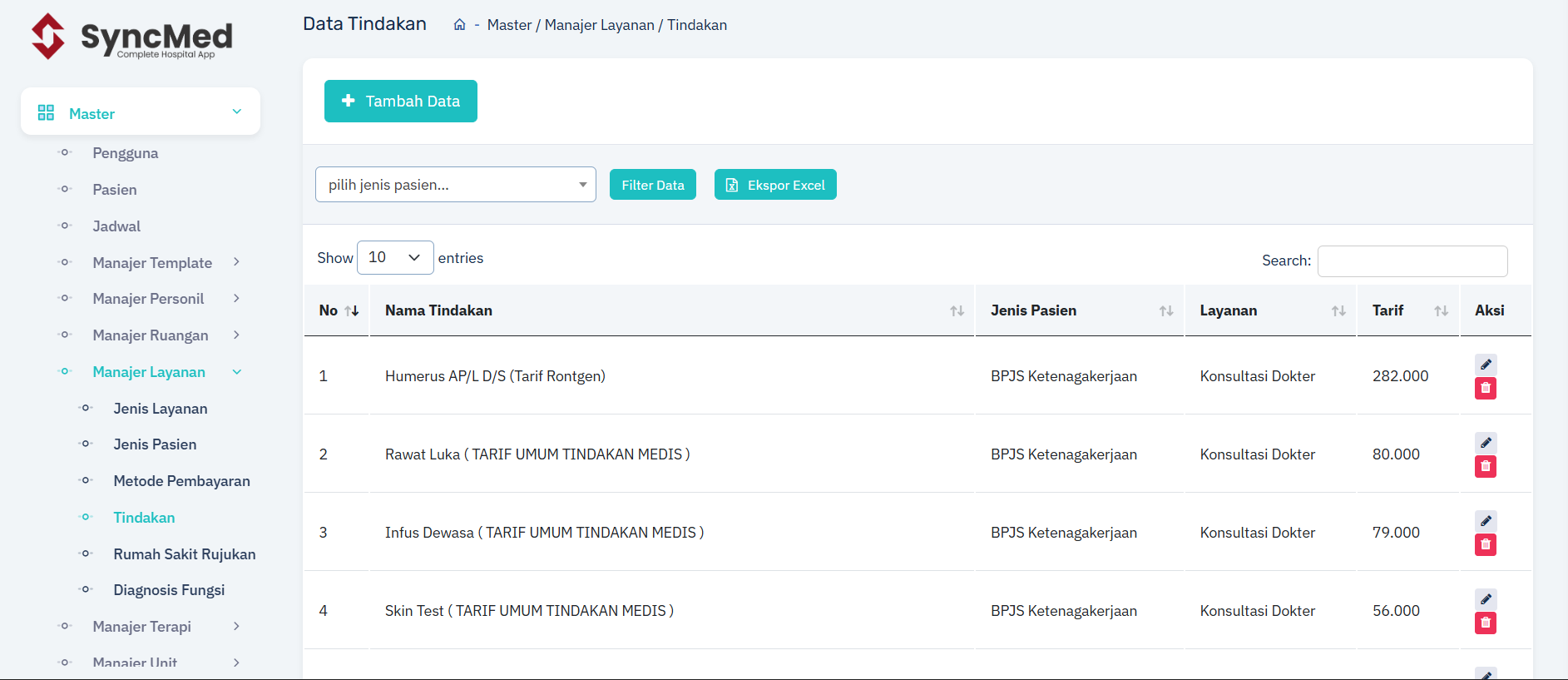 - Filter & Ekspor: Gunakan tombol Filter Data untuk menyortir berdasarkan jenis pasien, dan tombol Ekspor Excel jika Anda membutuhkan laporan daftar harga tindakan dalam bentuk spreadsheet.