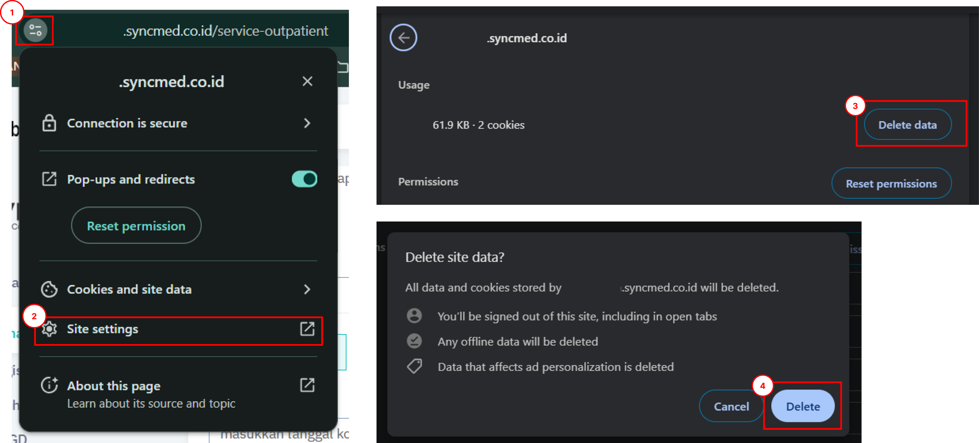 - Cara Cepat di Chrome: Klik Gembok -> Cookies and Site Data -> Manage cookies and site data -> Klik icon Sampah di sebelah nama web SIMRS -> Klik Done.